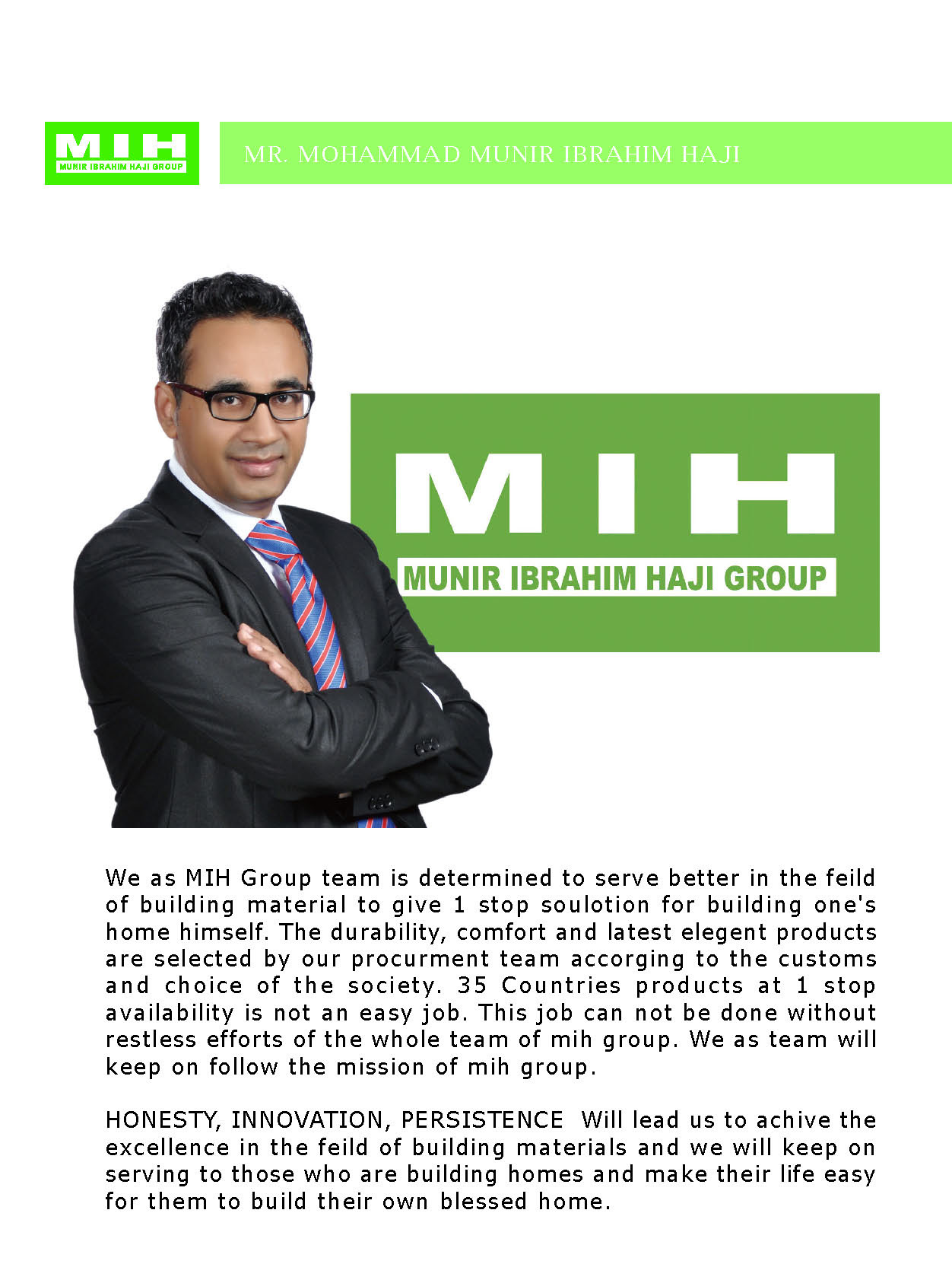 Munir Ibrahim Haji Group. This endeavor turned out with wonderful success and enabled him to build a pillar for Munir Ibrahim Haji Group, which deals in trading business in the field of Aluminum extrusion, glass, and